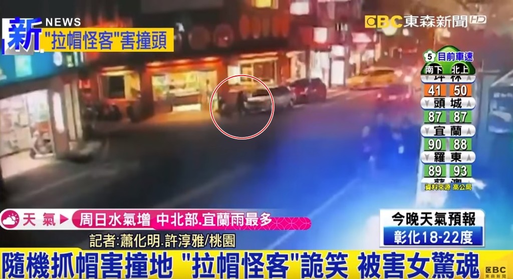 桃園市中壢一名懷有身孕的林姓女子2月28日外出買晚餐,但卻遭到一名詭異的中年婦女拉扯外套後方的帽子,導致林女重心不穩當場重摔、頭部還直接著地;更讓林女崩潰的是,這名婦人在拉扯後還不斷鬼吼鬼叫,甚至面露異樣笑容,讓林女當場嚇哭。