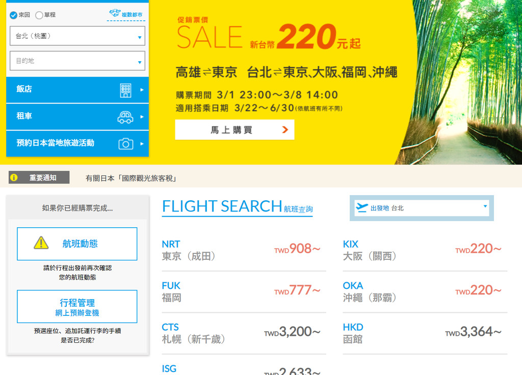 香草航空促銷時間自1日晚間11點到8日下午2點,適用搭乘日期為22日起(依各航線而異)。台北-大阪、台北-沖繩,單程均為220元起,適用搭乘日分別至5月7日及5月31日;台北-福岡單程777元起、台北-東京單程908元起,高雄-東京則為938元起,均適用至6月30日;以上價格均為單程未稅價。