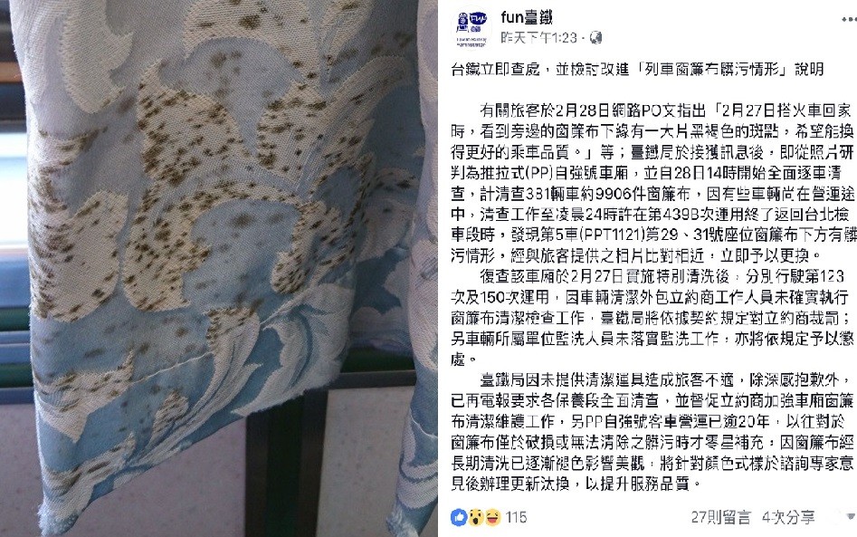 有關旅客於2月28日網路PO文指出「2月27日搭火車回家時,看到旁邊的窗簾布下緣有一大片黑褐色的斑點,希望能換得更好的乘車品質。」等;台鐵局於接獲訊息後,即從照片研判為推拉式(PP)自強號車廂,並自28日14時開始全面逐車清查,計清查381輛車約9906件窗簾布,因有些車輛尚在營運途中,清查工作至凌晨24時許在第439B次運用終了返回台北檢車段時,發現第5車(PPT1121)第29、31號座位窗簾布下方有髒污情形,經與旅客提供之相片比對相近,立即予以更換。