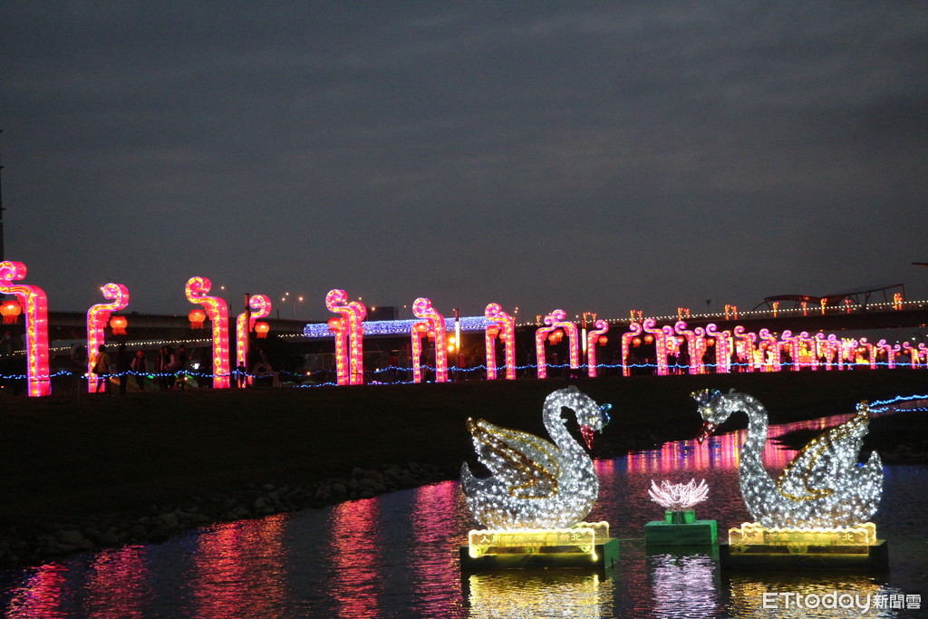 還有,由台北城市科技大學資工系與格致中學共同製作的「人間有情、蓮開新北」花燈, 2座天鵝花燈在夜晚白閃動人,倒映波光粼粼水面,就像是施華洛世奇水晶一樣閃亮,不但是相當受矚目的學生作品,串搭一旁的戀愛島嶼,更是浪漫指數爆表,也成為許多民眾臉書、IG分享的畫面。