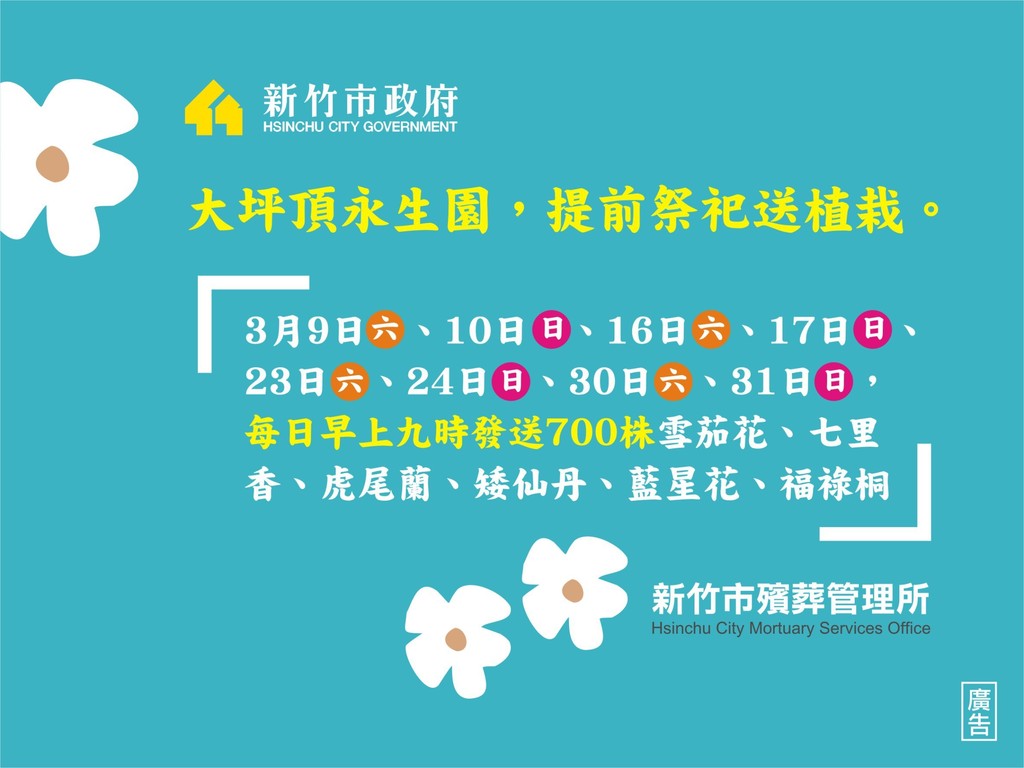 另市府今年也延續辦理提早祭祀送植栽活動,民眾若於三月份的周六、日,3月9、10日,16、17日,23、24日及30、31日等8日提前至大坪頂祭祀,就有機會在現場領取免費小盆栽,每日上午九時發送盆栽700株,送完為止,歡迎民眾踴躍領取。