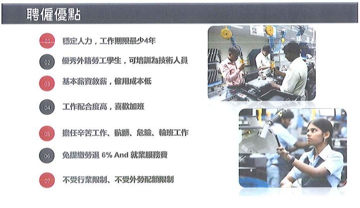 ▲簡報介紹,東南亞實習生喜歡加班,還能做危險工作。(圖/翻攝自東南科技大學簡報)