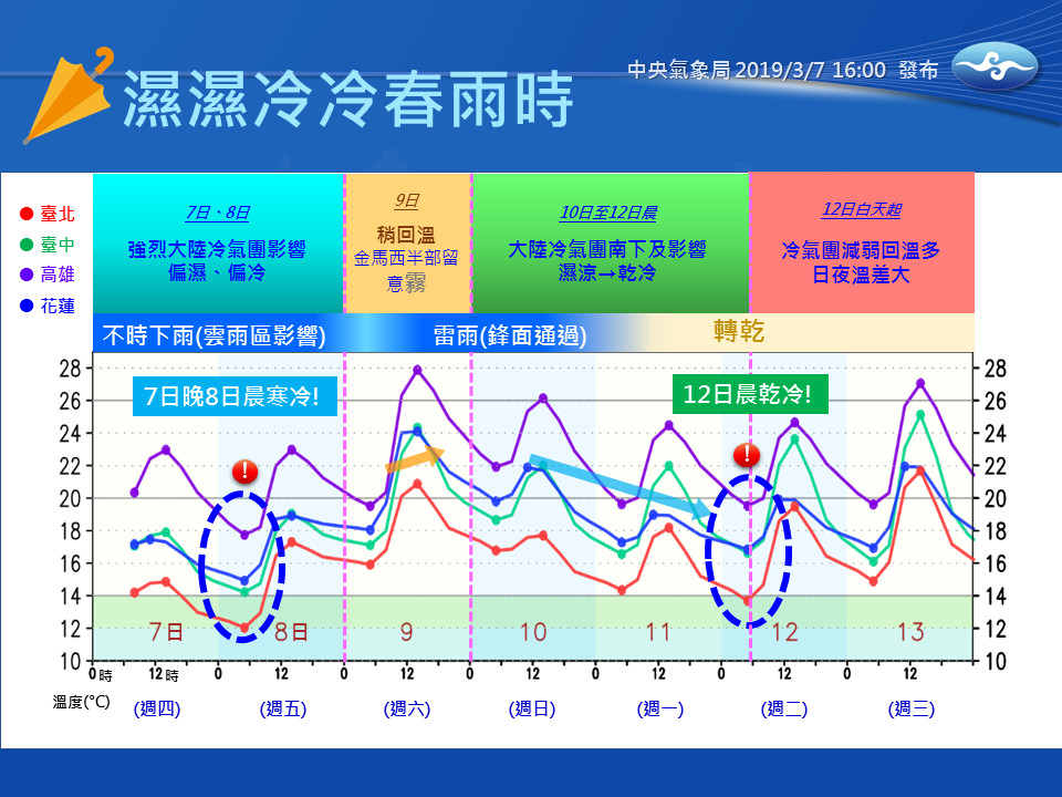 想要有比較舒服的天氣,預計要等到13日了,預估下週三後冷空氣減弱,清晨冷但中午回溫,日夜溫差會變大。氣象局提醒,春天天氣千變萬化,一定要比冬天夏天更頻繁關注天氣,可以的話「帶把傘和小外套,這幾天不會錯的。」