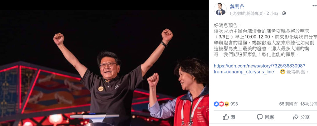 ▲潘孟安將到彰化縣分享台灣燈會成功經驗。(圖/翻攝自魏明谷臉書)