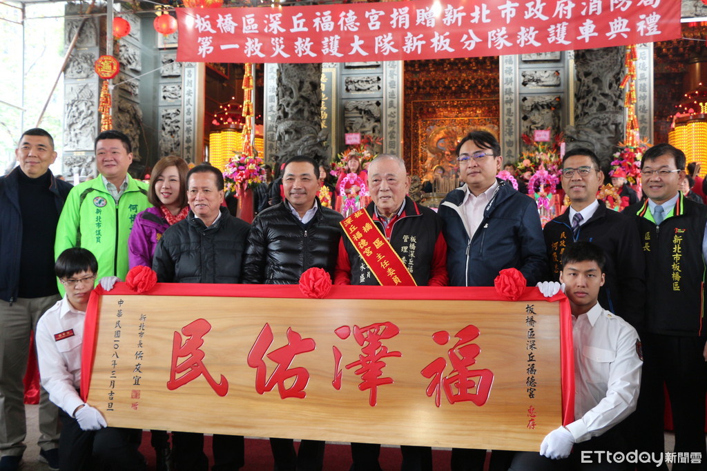 市長侯友宜表示,深丘福德宮是全台聞名的土地公廟,坐落在新板特區內香火鼎盛,特別選在土地公聖誕日贈送新北市救護車、自動心肺復甦機與自動甦醒器,除了彰顯福德正神福佑四方,也是宗教團體投入公益慈善的最佳示範。