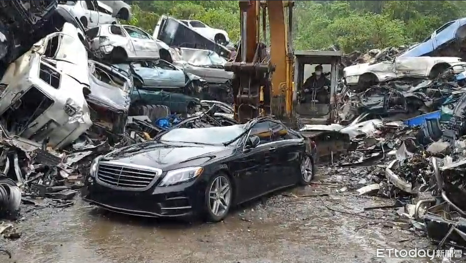 ▲700萬的賓士S550因未掛牌上路,落地僅4分鐘就被查扣,並於今日進行銷毀作業。(圖/記者郭世賢翻攝)