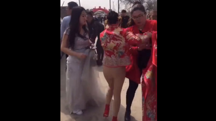 大陸婚鬧傳統一直存在許多爭議,婚鬧過頭事件層出不窮。日前微博上又瘋傳一段影片,一名新娘穿著中國傳統服飾,下半身的裙子竟遭扯掉,這過分的行為讓她相當不爽,當場暴怒離去。