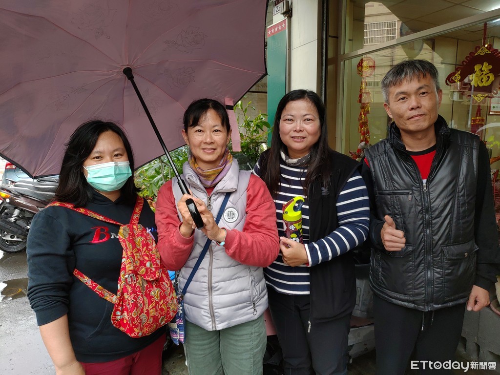 ▲熱心救護民眾姚坤助、吳可芸、洪淳婷、林育均(從右至左)用餐路過,趕緊放下手上筷子撐起雨傘救人。