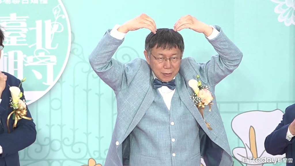 台北市長柯文哲10日出席台北市第218場聯合婚禮,擔任證婚人,與新人一起進行「假人挑戰」,只見柯文哲雙手比大愛心定格,呆萌表情呈現在大螢幕上,讓現場新人都笑翻了。