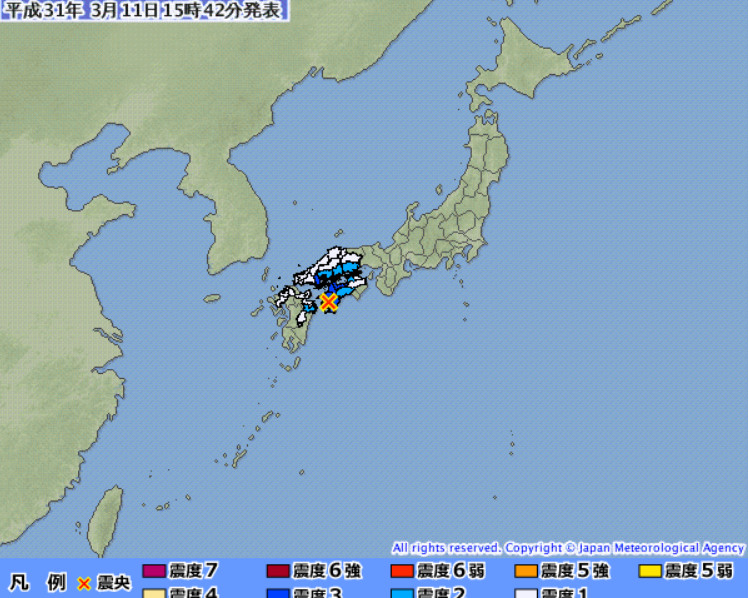 日本愛媛縣當地時間下午3時37分左右發生規模4.5地震,最大震度為3,震央南予,深度40公里。山口縣周防大島町、愛媛縣松山市、今治市、宇和島市、八幡濱市、大洲市、高知縣宿毛市、四萬十町等地最大震度到達3。氣象廳表示,此次地震並無引發海嘯疑慮。