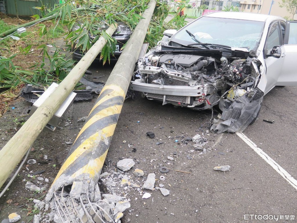 ▲▼陳男撞斷路旁2支電線桿,電線桿倒下後直壓1台路旁車輛,所幸僅受頭部輕挫傷。
