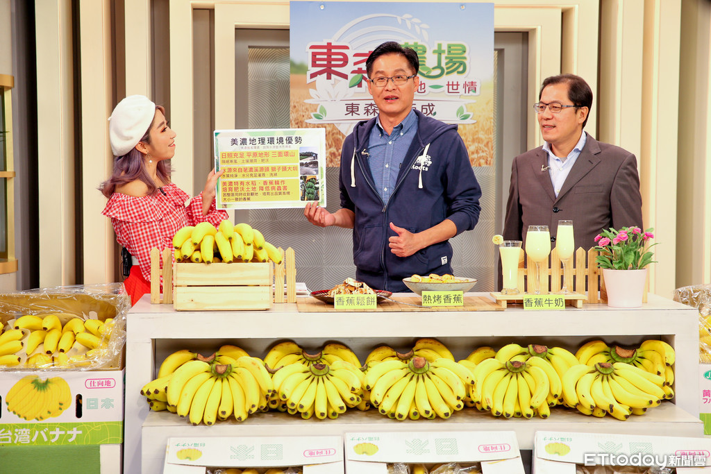 ▲高雄市農業局長吳芳銘(右)、美濃農會總幹事鍾清輝(中)特地北上到東森購物台進棚賣高雄香蕉,希望能幫蕉農拚經濟,最後限量1,000箱香蕉提前在33分鐘全部搶購一空。(圖/記者徐文彬攝)