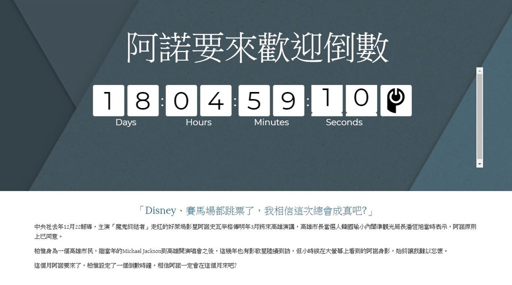 ▲阿諾要來歡迎倒數計時器。(圖/翻攝自官網)