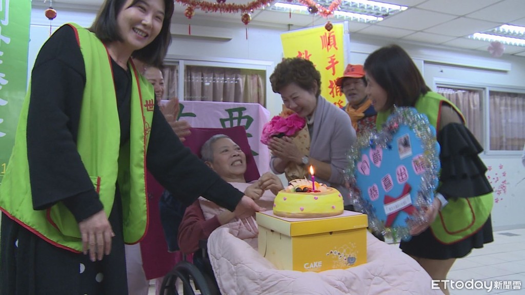 ▲創世基金會苗栗分院,特別為昏迷甦醒的老婦準備蛋糕慶生,苗栗縣長夫人蔡麗卿女士,也前來加油打氣 。(圖/記者黃孟珍翻攝)