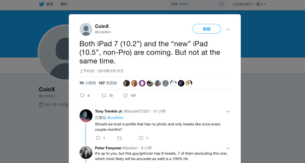 據了解,CoinX過去擁有準確的產品爆料紀錄,像是去年Apple發佈的iPhone XS、iPhone XS Max,以及iPhone XR三款手機的命名方式,還有2018年版iPad厚度為5.9mm,另外還有一些Apple產品的相關細節,他的爆料內容幾乎都相當準確。