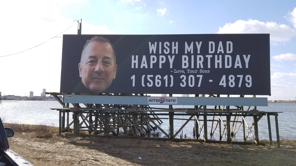 住在紐澤西州的邁克爾(Michael Ferry)、克里斯多福(Christopher Ferry)兄弟檔花了2000美元(約台幣6萬元),租下高速公路旁的大型廣告看板,上面放著即將歡度62歲生日的父親克里斯(Chris Ferry)的大頭照,旁邊寫著「祝我老爸生日快樂」,並留下了父親的手機號碼。克里斯多福開心地與完工的廣告看板自拍後,將照片放到臉書上,原本預計只會有幾個親友打電話來,沒想到事情就此一發不可收拾。
