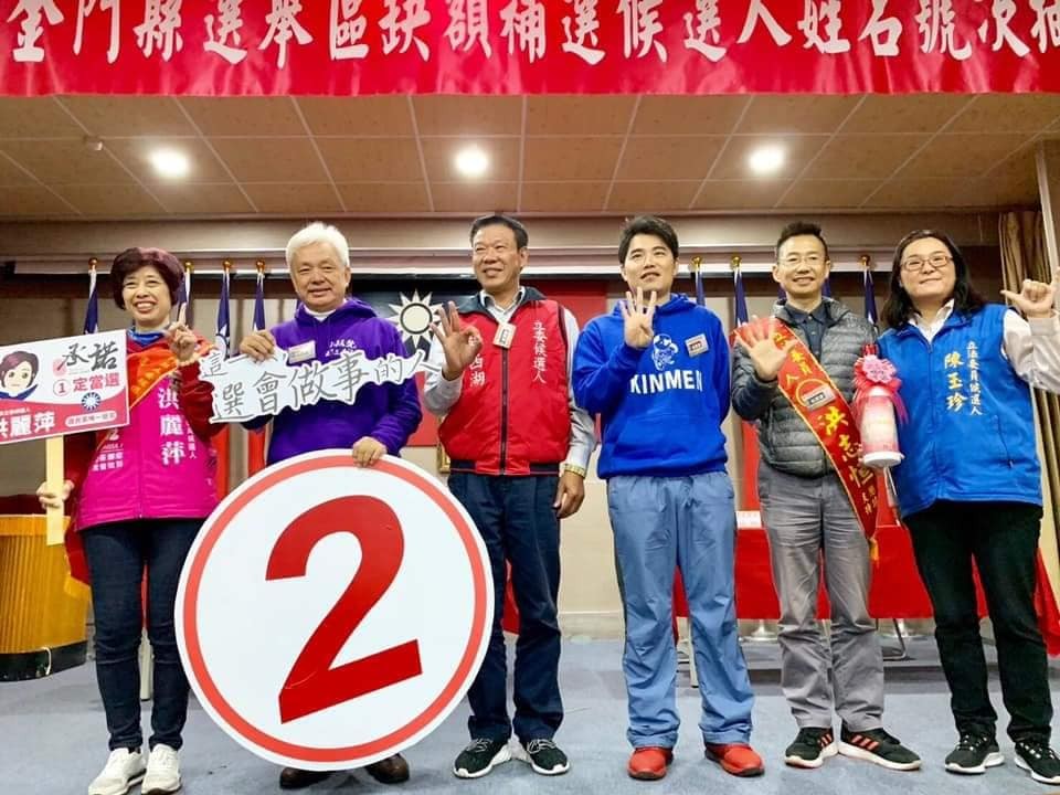 ▲ 金門縣立委補選候選人,左起為洪麗萍、陳滄江、蔡西湖、盧冠宇、洪志恒、陳玉珍。(圖/翻攝自陳滄江臉書)