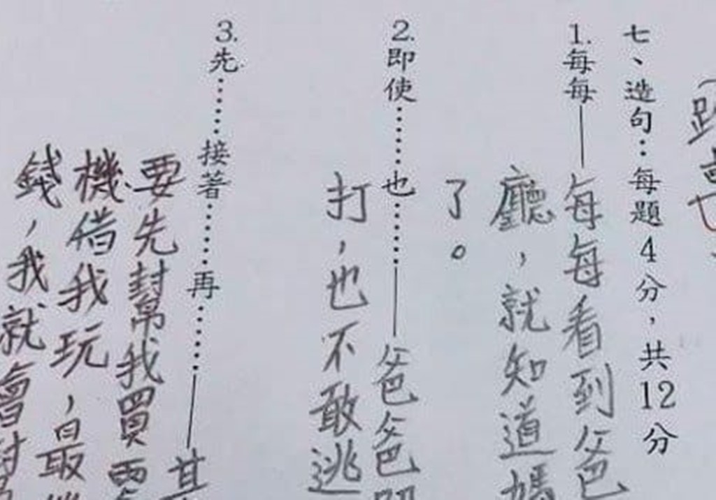 照片中可以看見,作業中有三題造句要回答,分別是「每每」、「即使……也」、「先……接著……再」等,第一題孩子回答說「每每看到爸爸跪在客廳,就知道媽媽又生氣了。」第二題則是「爸爸即使被媽媽打,也不敢逃跑」。