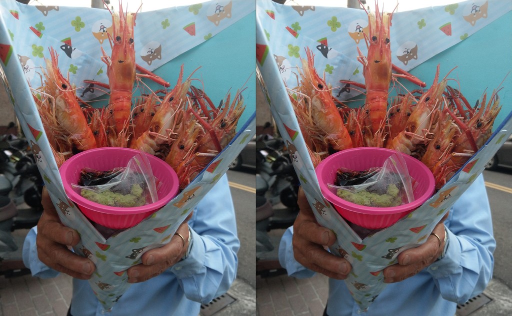 照片中,鮮紅巨大的蝦子一隻隻用特殊角度擺放、堆疊,最後製成一大把花束造型,擁擠程度超澎派,目測一束至少含有10隻以上大蝦,實用又食用,務實的美味選擇。