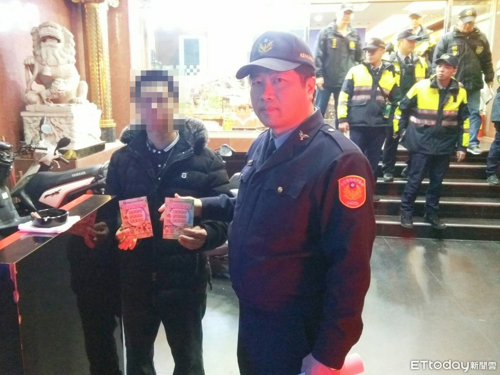 ▲桃園市警局中壢分局員警在治安熱點發放犯罪預防宣導卡片,籲請業者配合自主管理。(圖/記者沈繼昌翻攝)