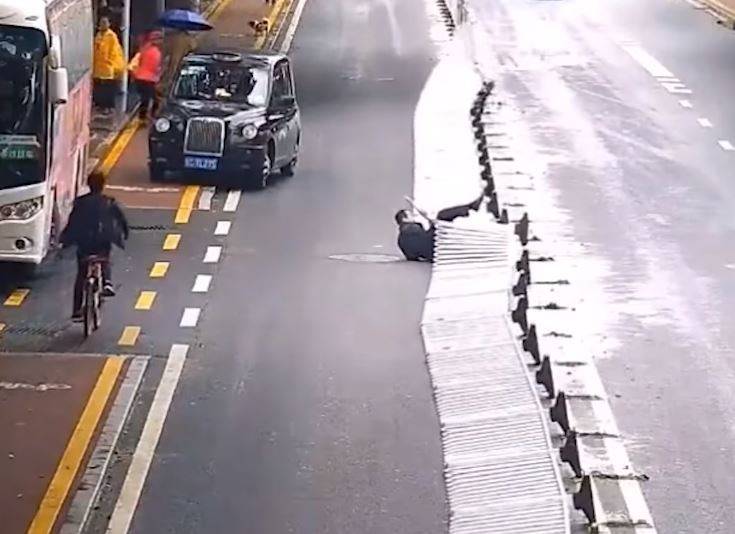 這段影片至今獲得11萬個讚,穿著一身黑的男子一手拿著雨傘穿越馬路,完全不顧後方來車,舉動相當危險,接著他跨坐在護欄上方等待,沒想到重心不穩突然往後跌,護欄也跟著倒下,而他的右腳還卡在欄杆中無法抽身。