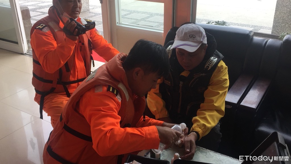 ▲台南海巡隊人員緊急對船長作初步消毒及包紮止血,並協助將漁船拖帶返回安平漁港。(圖/記者林悅翻攝,下同)