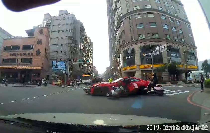 新北市一名陳姓男子18日下午4時許開著紅色福特「野馬」跑車,從環河西路右轉經過長江路口時,因為闖紅燈連撞3輛直行的機車騎士,3名騎士瞬間噴飛倒地,所幸都只有受到輕傷,2名騎士進一步送往醫院檢查,車禍肇事原因仍待警方進一步釐清。