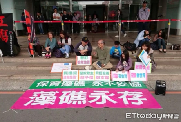 ▲搶救大潭藻礁行動聯盟展開在桃園市政府靜坐抗議。(圖/潘忠政提供)