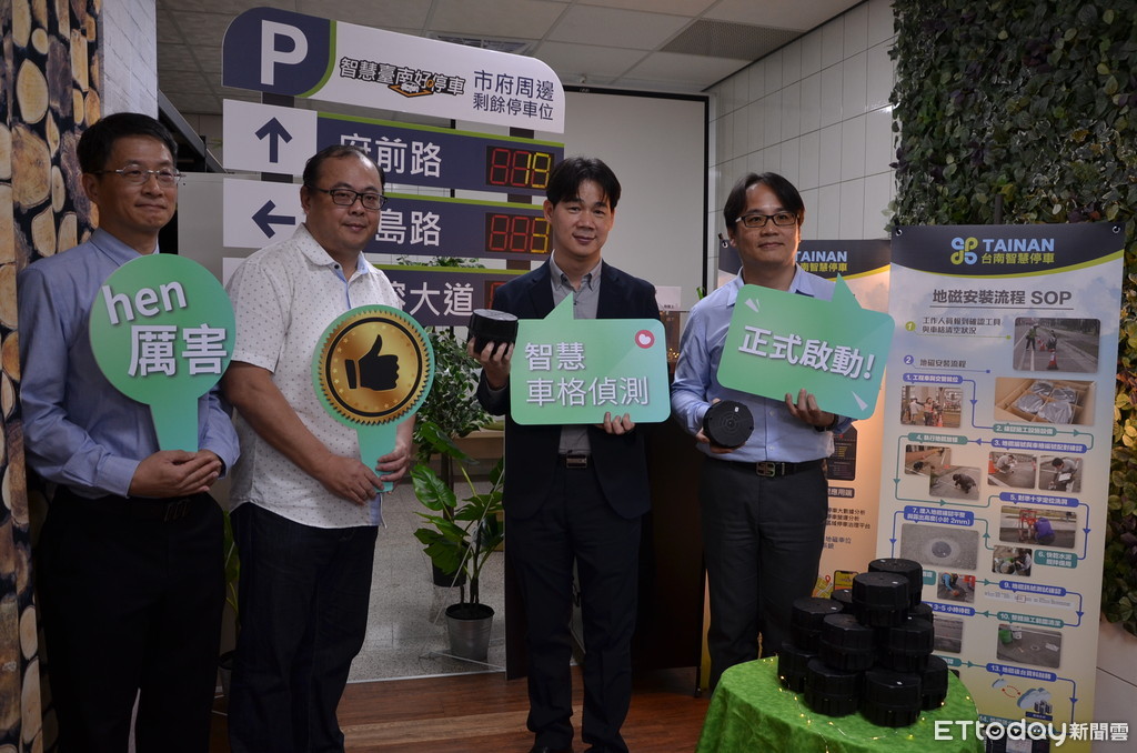 ▲台南市停車管理處處長黃俊傑(右一)指出,路邊停車格建置2500枚地磁偵測系統,透過APP、路口LED顯示器提供即時停車格位資訊,打造智慧停車城市。(圖/記者林悅翻攝)