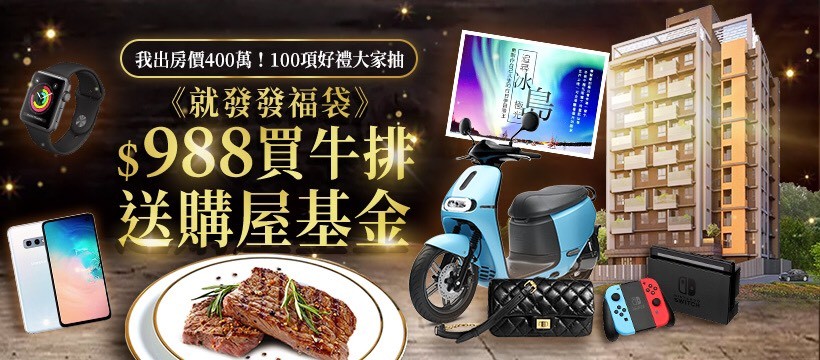 還記得農曆年期間的買福袋抽房子活動嗎?一位台中市的游先生就是這麼超級強運,買一次就中,讓他驚訝的直呼「太開心了!」,辦公室同事們看得好羨慕,已經都在鎖定下次活動時間,而其他網友則是敲碗頻問「房屋得主呢?」,但領房子不像領手機一樣簡單,目前活動主辦方正積極與得主接洽,協助辦理領獎相關程序,讓他能夠歡心入住。後悔錯過上一檔房屋福袋嗎?現在機會又來了,最狂特規牛排組合:就發發福袋之【988元買牛排送購屋基金】,第一特獎是幸福購屋基金400萬。