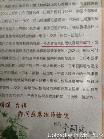 台大校長李嗣涔最近發出募款問候信,被校友揪出錯字,信中提到「各大專院校如雨後春筍『班』成立」,竟將「般」誤植為「班」,在網路上成了笑話四處流傳,有校友就開玩笑表示,「想上一堂『雨後春筍班』,看看到底教什麼。」 對此,校方則回應是行政疏失,會將開會檢討。