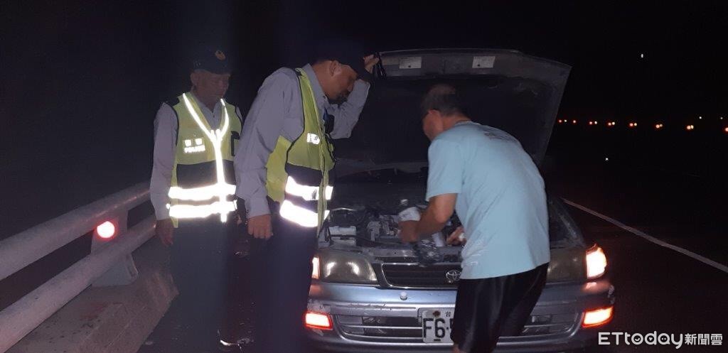 鄭員載黃民前往查看,發現自小客車因引擎水箱沒水溫度太高而拋錨,由於該路段偏僻且現場視線不良,警方隨即將巡邏車停在黃民車後方並開啟警示燈避免故障車輛遭後方來車追撞,另協助照明讓引擎水箱裝滿並能發動引擎,讓他開車順利返家。