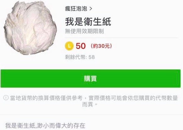 通訊軟體「LINE」的自創貼圖趨於飽和,反而是「怪到極點」的奇葩貼圖更容易吸引人。日前就有款爆紅的「我是衛生紙」貼圖,內容為被揉成各種形狀大小的40坨衛生紙,還是使用過的,吸引大批民眾購買,事後網友們也神解貼圖用法。
