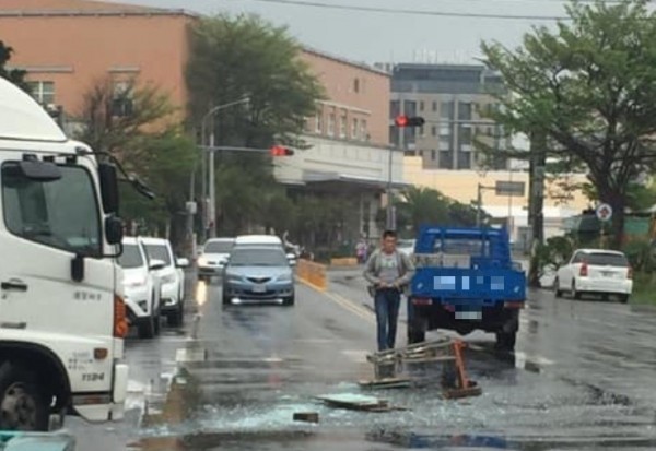 ▲藍色貨車行經鹿港市區時玻璃掉落一地碎片。(取自意外災難通報告密室)