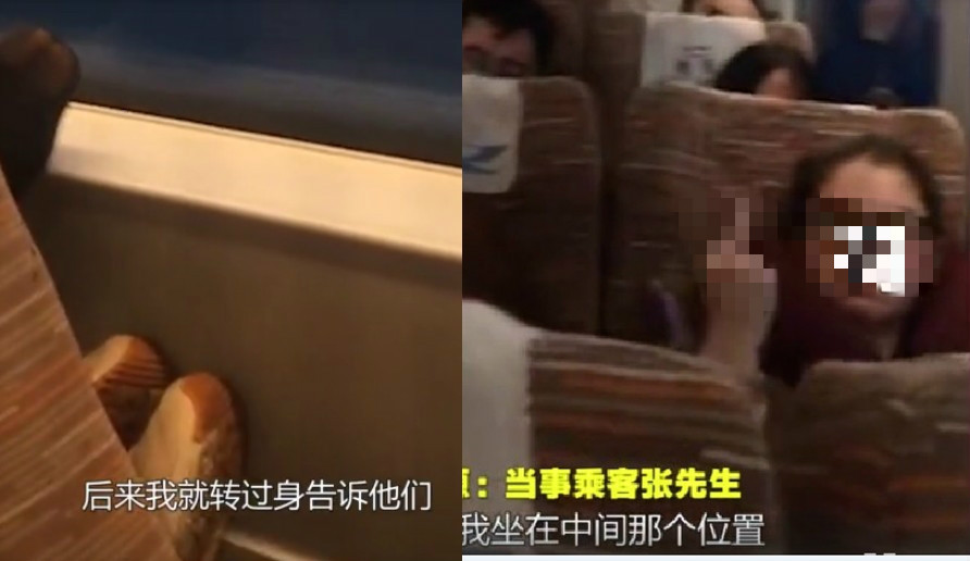拍攝影片的張先生表示,22日他搭乘京滬高鐵G126次列車,因為旁邊靠窗的乘客要起身,坐在中間位置的他便也跟著起身,結果意外發現有雙腳搭在窗戶上,他便轉身請後排的外國女子放腳,對方就對他比中指。