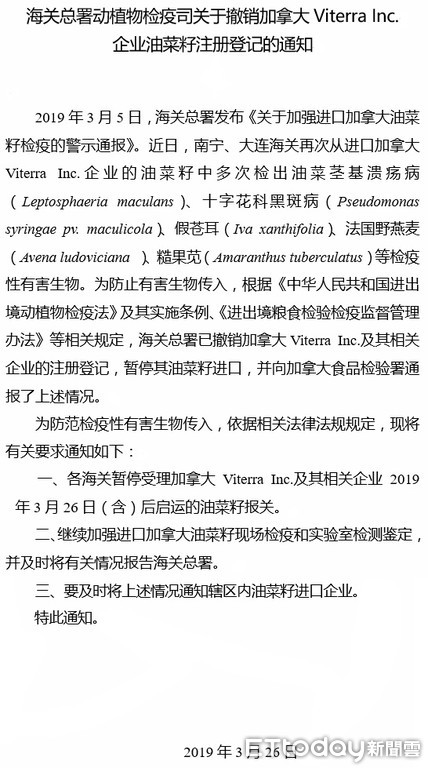 ▼中國海關總署再禁加拿大油菜籽。(圖/翻攝自中國海關總署)