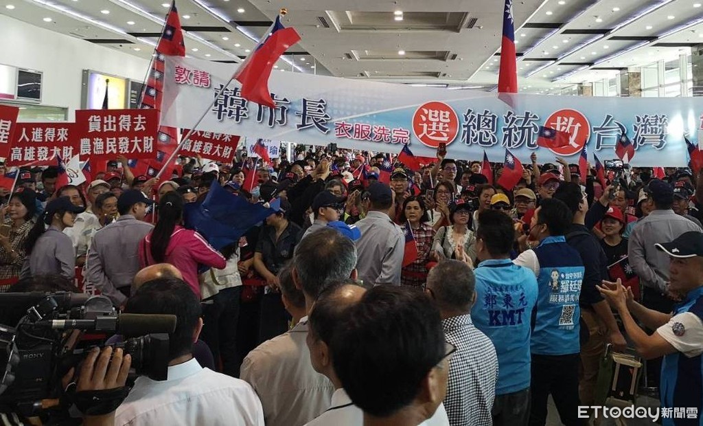 高雄市長韓國瑜為期6天的訪陸行程結束,28日上午返抵高雄小港機場,一早上千名「韓粉」就在機場外高舉國旗等待韓國瑜,一見到他出現立刻齊聲高喊「選總統救台灣」,場面相當熱鬧。