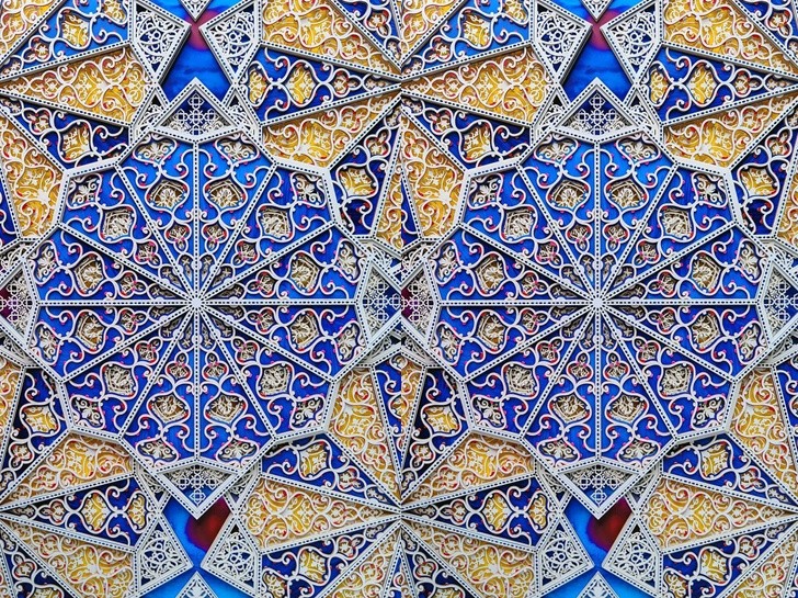 這些有著繁複圖案及豐富多彩層次的作品,看起來不像是一個地方的產物,源自於藝術家約旦和英國雙重國民背景的多元文化土壤,以及長期生活在中東地區的影響。