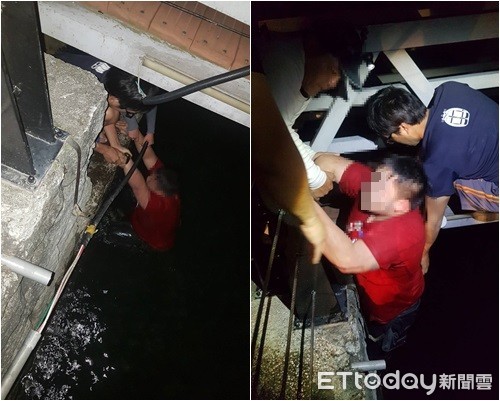 警消表示,29日凌晨5時許接獲通報,一對情侶墜入淡水金色水岸,救護人員到場時發現28歲的游女與17歲的男友臉色蒼白,緊抓岸邊包覆電纜的水管,眼看就要被河水沖走,救護人員隨即跳入水中,從下方先將失去力氣的游女擒抱上岸,因男子體型較魁梧,則由上方兩名隊員合力將男子拉至岸上。