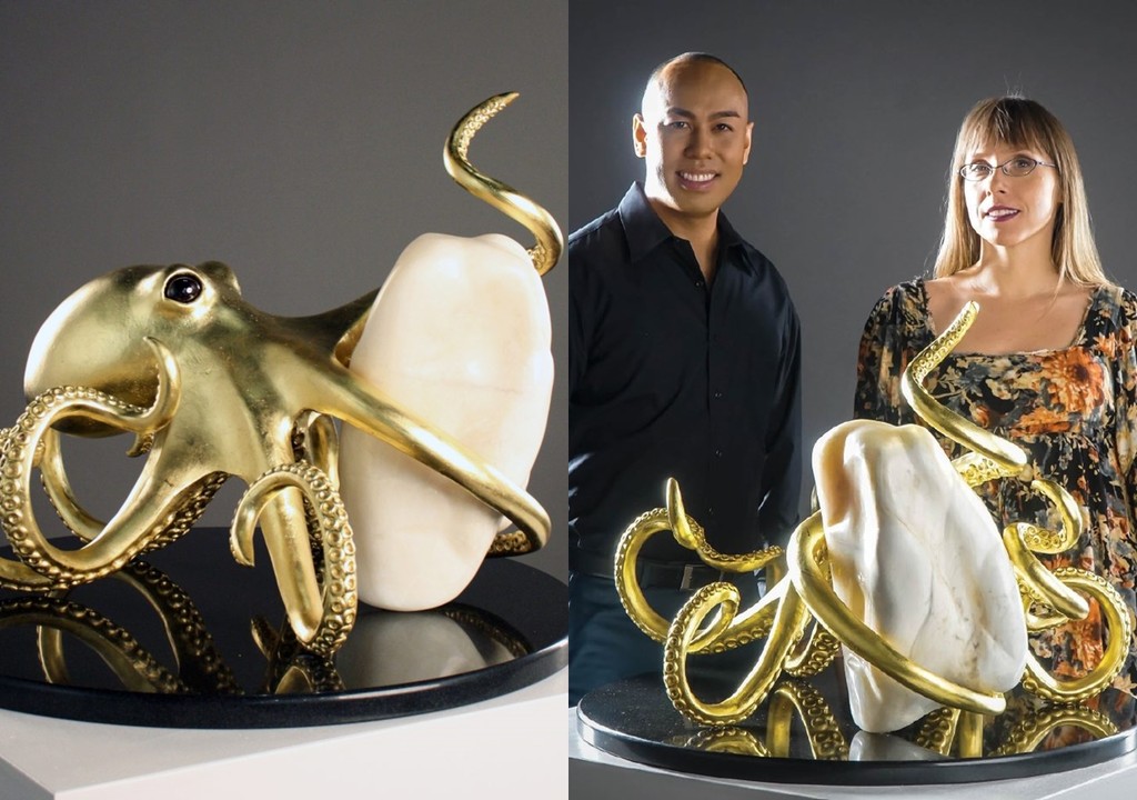 ▲瑞伊斯訂做了一隻黃金章魚,作為放置巨無霸珍珠的展示台。(圖/翻攝自The Giga Pearl官網)