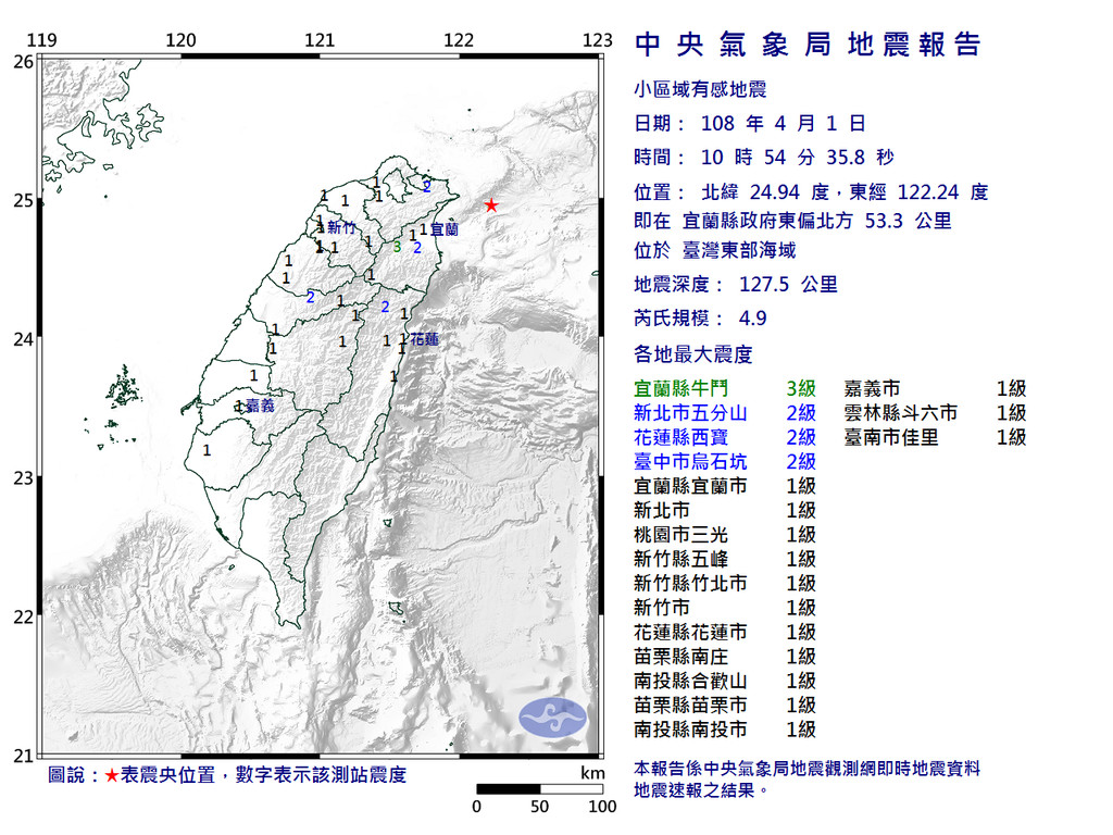 地牛翻身!根據中央氣象局的地震報告,1日上午10時54分發生芮氏規模4.9的有感地震,震央位於東部海域,地震深度127.5公里,宜蘭縣最大震度3級,新北市、花蓮縣、台中市震度2級,桃園市、新竹市、新竹縣、苗栗縣、南投縣、嘉義市、雲林縣、台南市震度1級。