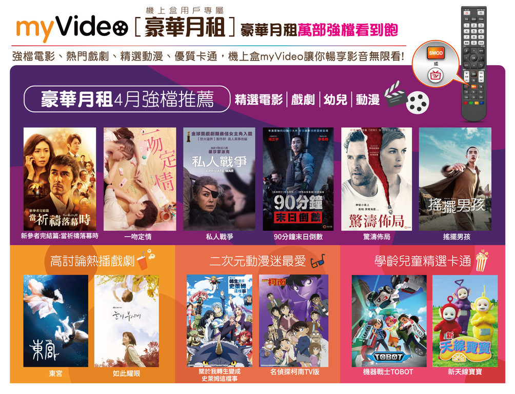 機上盒「myVideo豪華月租」在連假期間也將上架由韓團EXO演技派偶像都敬秀主演的《搖擺男孩》、改編自著名戰地記者瑪莉爾科文故事的《私人戰爭》、重新翻拍同名台灣經典偶像劇的《愛情白皮書》以及為兒童節推薦的《機器戰警TOBOT》及《汪汪隊立大功》等卡通。