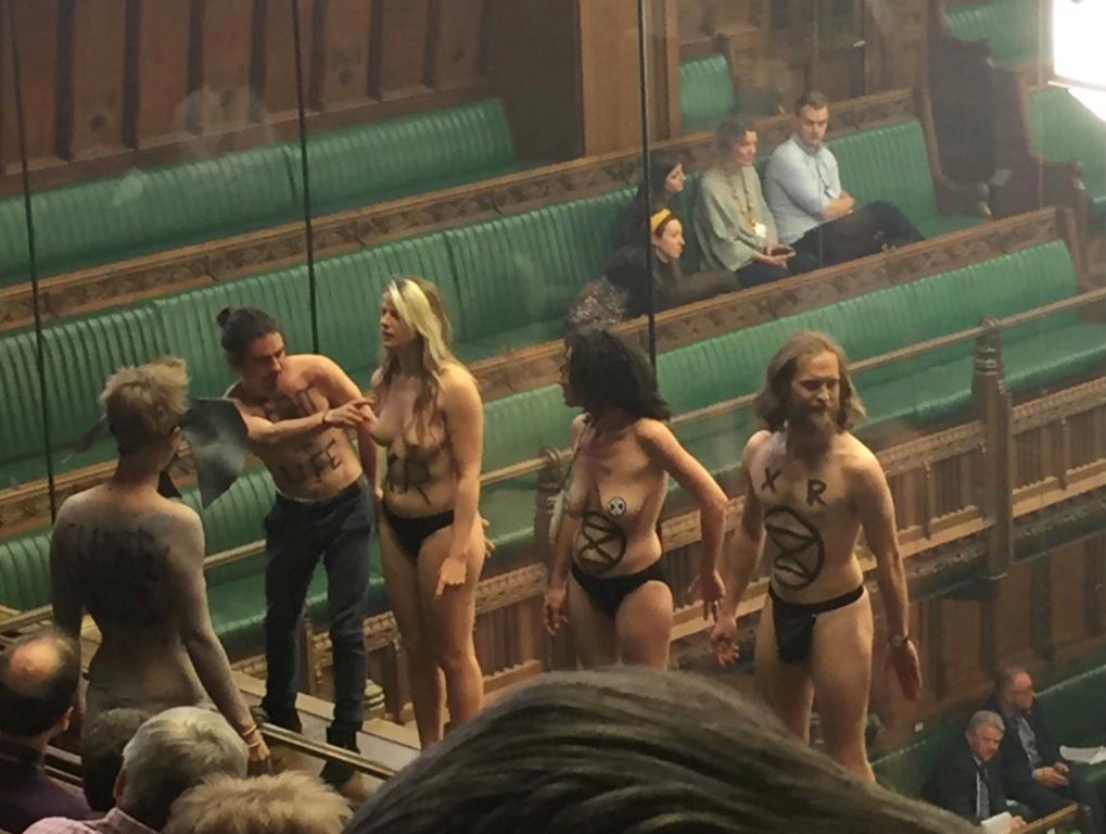 英國下議院周一(4月1日)辯論脫歐替代方案時出現一段小插曲。12名裸著上身的環保人士闖進二樓旁聽席示威,抗議氣候變遷,讓議事被打斷,議員們無法進行辯論。在野工黨前黨魁米勒班(Edward Miliband)更是氣嘟嘟的瞪著示威者。此事件擾攘約25分鐘,12人最後全被逮捕。