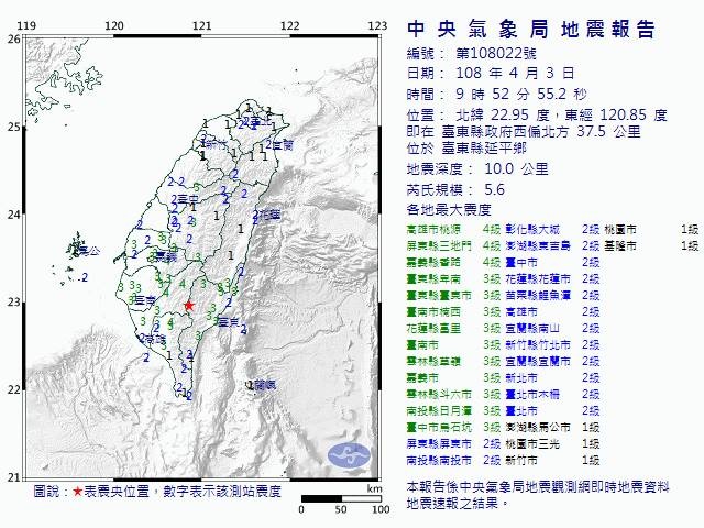 根據中央氣象局最新資訊,3日9時52分發生芮氏規模5.6地震,地震深度10.0公里,震央位於台東縣政府西偏北方37.5公里(位於台東縣延平鄉),最大震度高雄市、屏東縣、嘉義縣4級。台鐵富里=太麻里間按地震4級規定辦理,會加強播音以服務旅客。