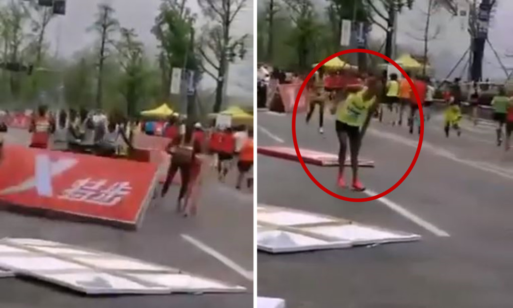 重慶3月31日舉行國際馬拉松比賽,來自世界各地共3萬名選手到場參與,但賽事進行到一半,天外便飛來一架直升機吹倒分隔板,場面一度相當混亂,導致非裔選手關節被撞到扭傷,當場變成跛腳無法繼續參賽。