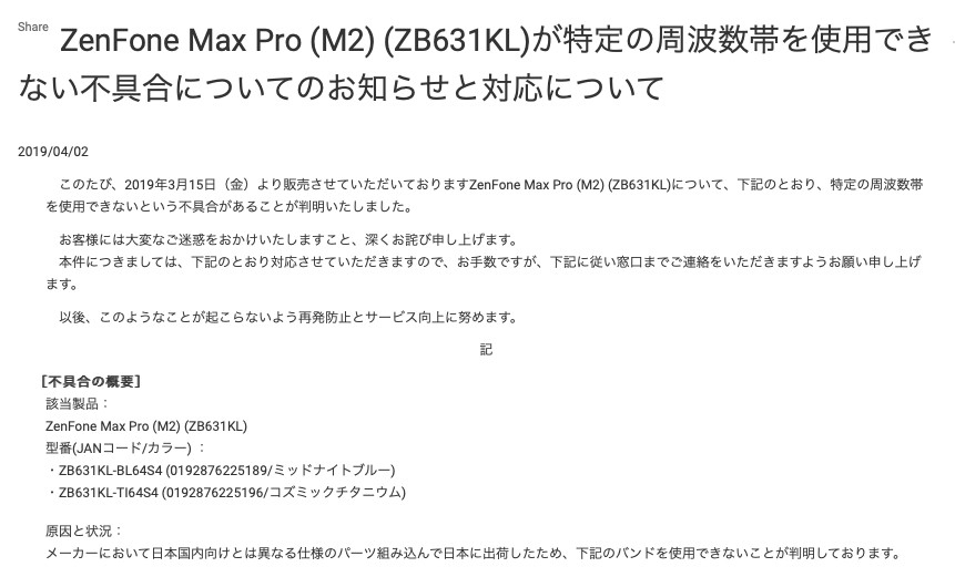 ASUS Japan 指出,主要是因為組裝廠使用和日本國內規格相異的零件,並出貨到日本,但是消費者若在日本國內使用無法使用特定頻寬問題的ZenFone Max Pro M2,恐將違反日本電波法,因此請消費者務必更換或退貨。