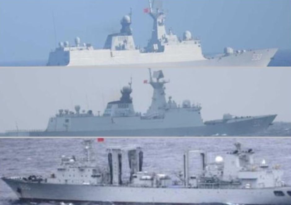 經識別查證後確認,分別為兩艘054A型導彈護衞艦「荊州號」與「徐州號」、以及「巢湖號」903A型綜合補給艦。 3艘中共軍艦穿越沖繩與宮古島之間海域後,繼續向西北方向行進,進入東海海域。
