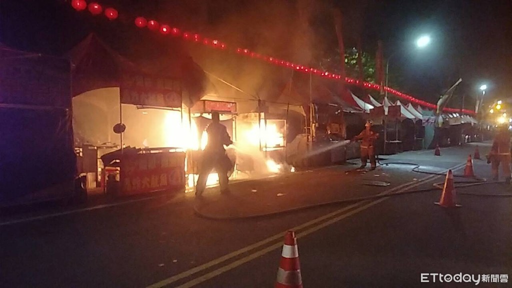▲台南下營上帝廟前攤位凌晨傳出火警,現場火勢很大,在消防人員全力射水搶救下,火勢很快被撲滅,幸無人員傷亡。(圖/記者林悅翻攝,下同)