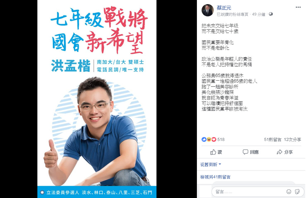 蔡正元5日在臉書上貼出洪孟楷的宣傳照,並且寫下「把未來交給七年級,而不是交給七十歲。國民黨要年輕化,而不是老齡化。政治公職是年輕人的責任,不是老人把持權位的馬桶!」