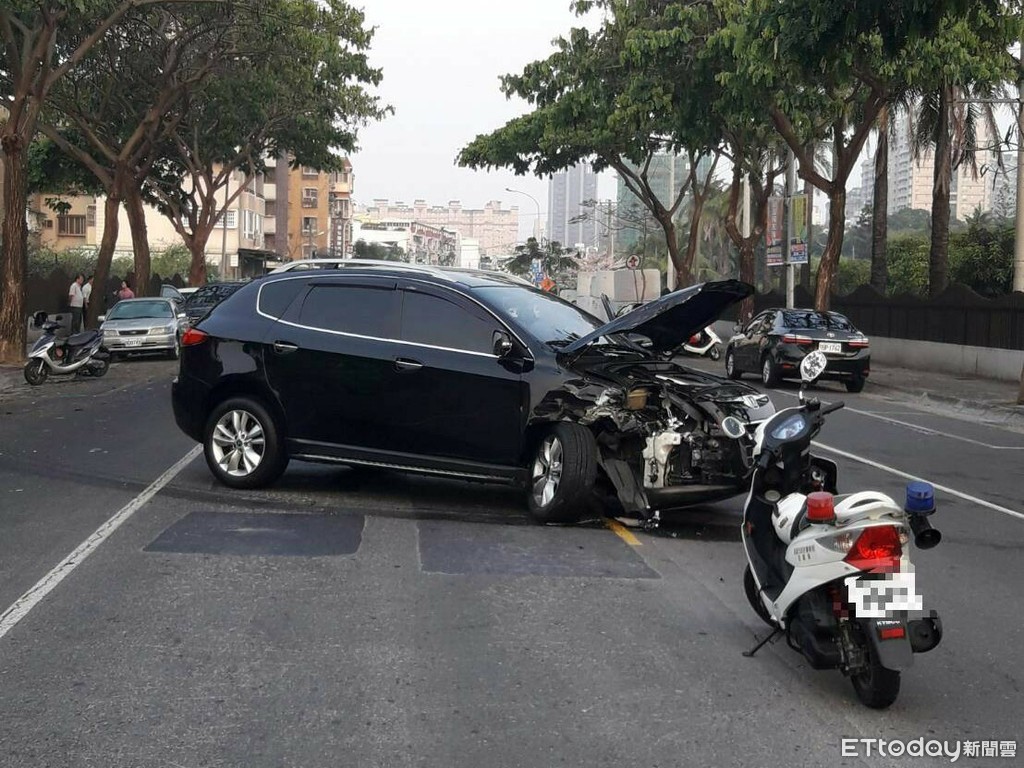 照片中可以看到,黑色休旅車車頭全毀,引擎蓋整片掀開,連輪胎都撞歪了,看得出撞擊力道不小,另一部被撞上的小客車,原本正準備要路邊停車,卻無辜被撞,還接著追撞路邊另外兩部車,黑色休旅車則一路衝到對向車道,小客車上一對林姓夫妻,當場被撞到頭昏眼花,警方趕到場,趕緊將這對夫妻和酒駕男都送上救護車。